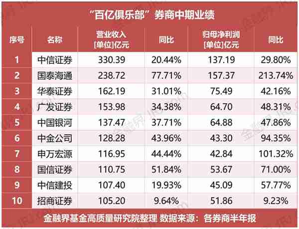 从归母净利润来看,国泰海通荣登冠军宝座,其上半年实现净利润163.21亿元,同比增速达到207.02%,超出第二名中信证券21.75亿元。
